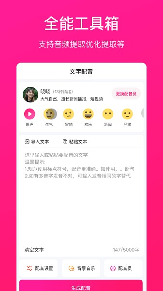 配音大师手机版可以在这里自由使用文字转语音工具,能够帮助大家生成超多类型的语音文件,无需自己动口配音,让系统根据输入的文字轻松的生成语音文件了,每次生成的速度都是超级快的,大家之后也可以自由编辑语音文件。