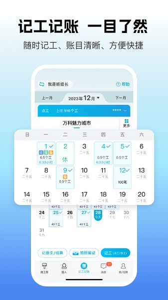 1、在记工日历页左上角将你的身份选择为[我是班组长],再点击[记工]。