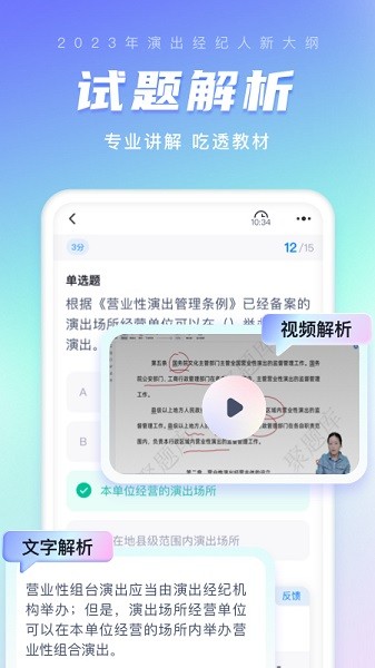 演出经纪人题库内含考点练习,全国通用卷以及地区卷模拟练习,以及按照固定考试比重的随机式的抽题的真题考场。