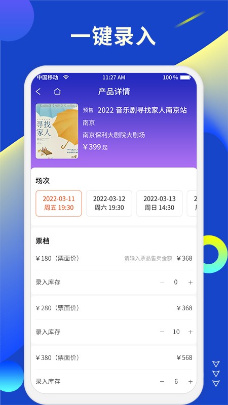 可以将产品信息进行一键录入,录入票务的场次时间以及票面价格信息上架操作。