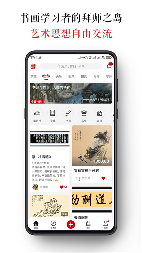 墨客岛是一款专为书画爱好者、艺术创作者及艺术爱好者打造的多功能平台,由广州墨客岛文化发展有限公司出品。该平台集艺术成果展示、原创作品拍卖、艺术思想交流及教学互动于一体,为用户提供了一个全面而丰富的艺术生态环境。通过汇集每个人的知识和见解,您可以体验丰富的文化知识,这里也是书画收藏家的寻宝岛,您可以欣赏岛上常驻艺术家的原创作品,浏览画作销售价格,查看图片信息,有需要的用户直接下载就可以开始体验了。