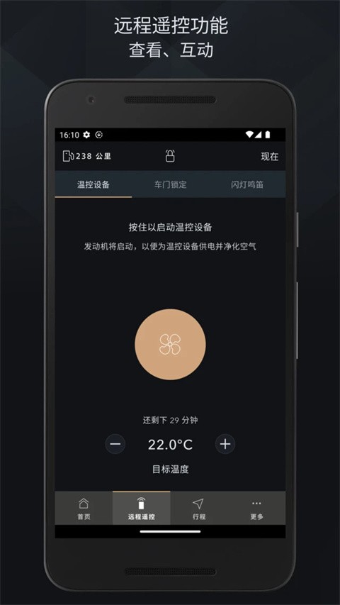 2、出行前远程调节车内温度,获得车内凉爽或温暖的环境(具体是否可用及功能需根据车辆安装);