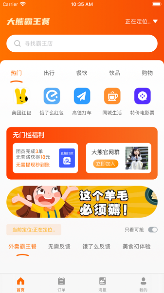 大熊霸王餐app为大家带来了非常丰富的外卖优惠券,让大家每次点外卖都能省钱的,各种活动也是可以及时的进行参加。聚合了多个外卖平台,前往任意平台下单想吃的美食都行的,能够低价点外卖了,这里每天可以无限制领取优惠券。