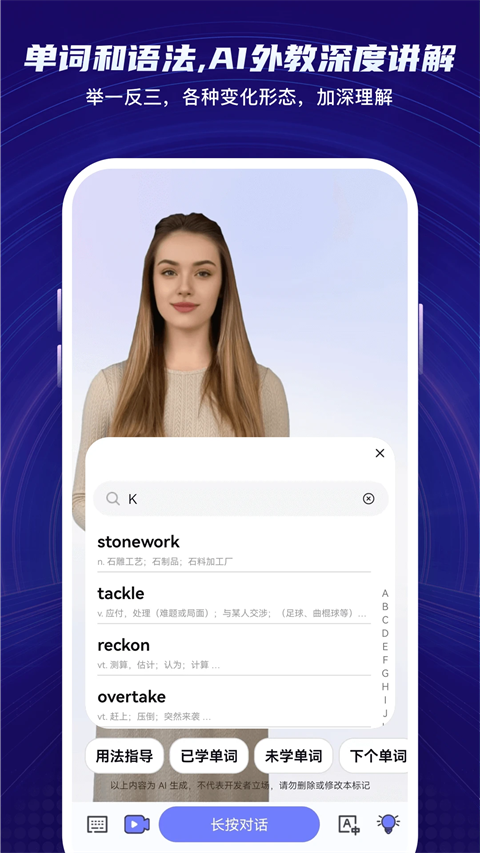 倚塔口语练习是一款专为提升英语口语能力而设计的智能学习工具。利用先进的AI技术,为用户提供沉浸式的英语学习体验。通过全真视觉外观和二语语言的全新虚拟交互,软件为用户打造了一个无形的课堂,让用户在虚拟现实中与模拟的异国新世界进行全方位的互动和探索,同时提升外语语言能力。并且提供多种场景的口语会话,让您足不出户走遍世界,真正沉浸式学习英语口语,如果你的口语能力还处于入门阶段,你可以通过倚塔口语练习从基础开始学习,有需要的用户直接下载就可以开始体验了。
