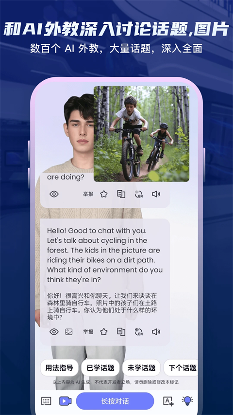 开放的对话不受时间和地点的限制。 它就像一个随身的英语伙伴,可以随时随地练习英语口语。