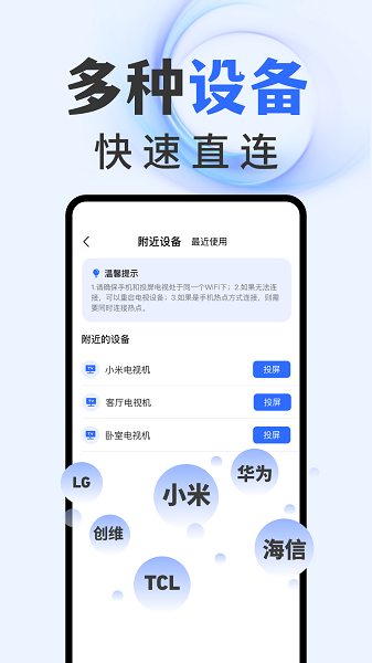 智能电视投屏软件可以让大家在这里连接各种型号的智能设备,想怎么在大屏幕上显示各种文件都行的,从手机上极速的进行投屏,每次设置参数都很方便的。线上可以连接多种设备,都是可以轻松的进行管理,在局域网下进行投屏了。
