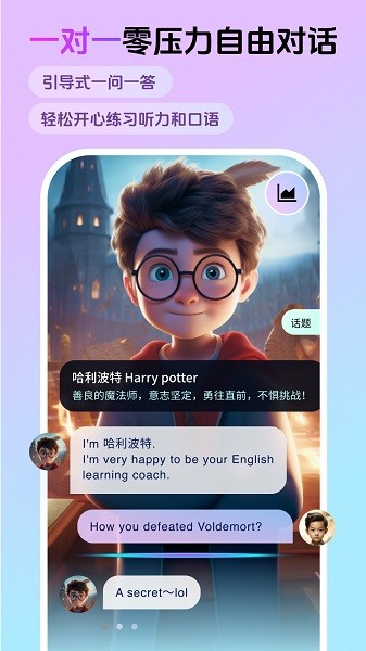 通过用户熟悉的、有着丰满性格特征的智能体人物角色,让用户更容易进入沉浸式快乐口语练习。没有门槛,任何不同难度的对话,都可以一键实时通过推荐示例获取帮助指导,边学习边应用。