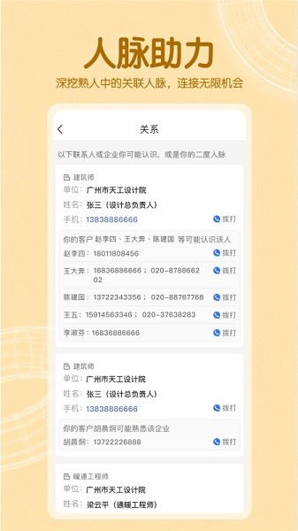 帮你挖掘甲方、设计、施工负责人背后的关系,帮你更容易接触到他们。