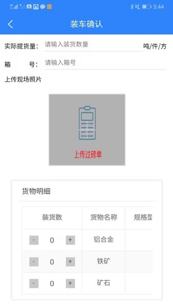 完成货物的装车任务时上传货物的装车信息对装车流程进行确认。