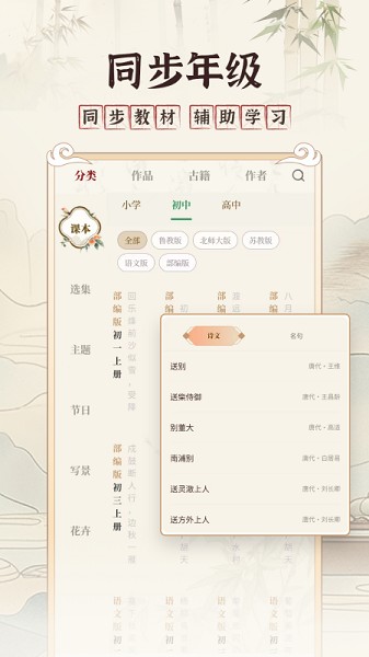 涵盖小学初中高中大学各类古诗词文言文大全,包括诗经、楚辞、文言文、唐诗、宋词、元曲等经典作品。大量名篇佳作,让您尽享古诗词的韵味。