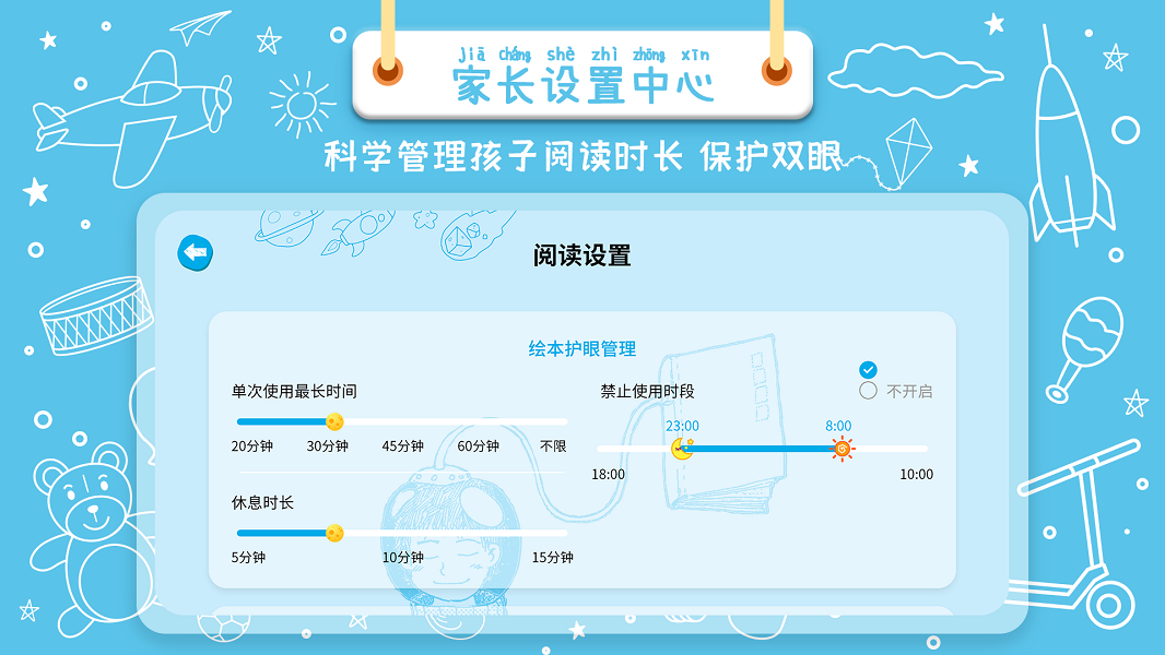 可以设置app使用时长限制,超时自动进入休息模式,让孩子养成良好的阅读习惯,家长更放心。