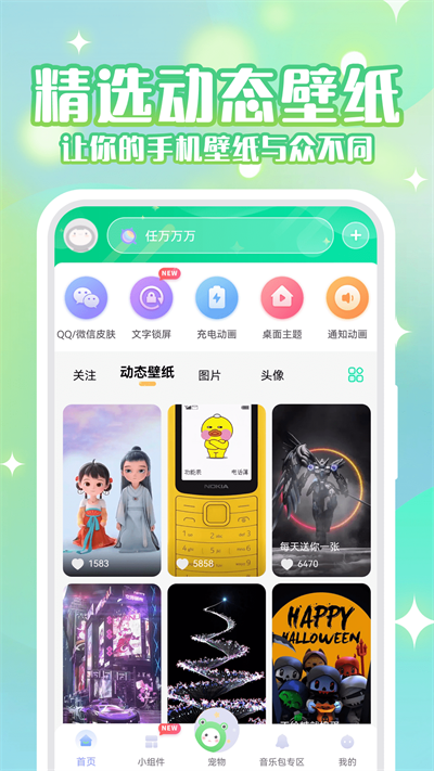炫酷跑马灯、情侣分屏壁纸、治愈系风景壁纸、个性文字壁纸、专属姓氏壁纸、卡通动漫壁纸、游戏动态壁纸、影视人物壁纸、液体壁纸等。