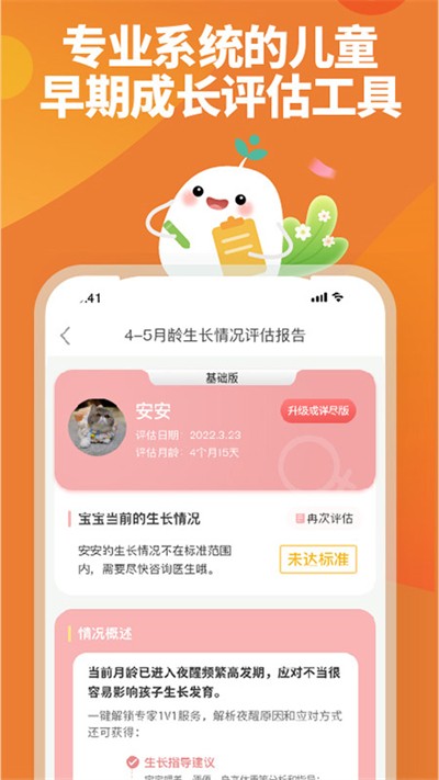 - 成长评估:评估0-3岁宝宝的生长发育,从5大方面逐一进行分析,帮助家长全面了解宝宝的粗大运动、精细运动、语言、社会适应和认知发展情况。