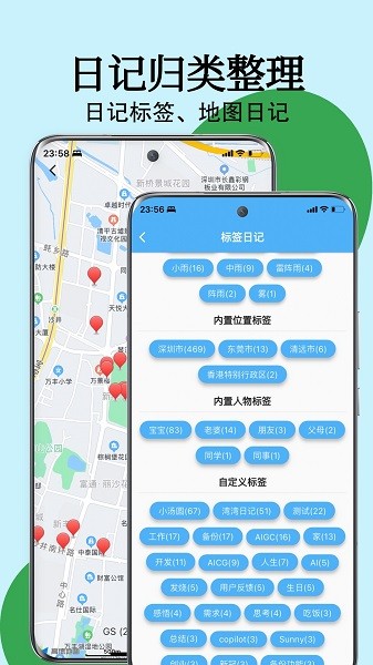 8、自动给日记打标签,可以自定义标签,并可以按标签分类查看日记。