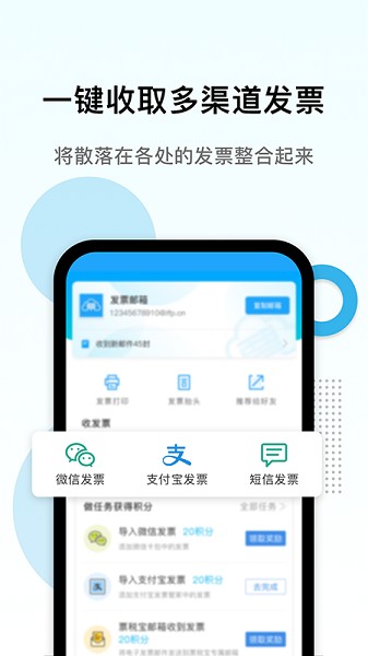 “爱发票”专属邮箱直接收取商家开具的发票。一键收取微信、支付宝、短信等渠道发票;
