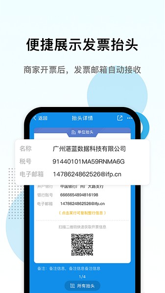 无需记住公司抬头税号,输入公司名称自动匹配税号等开票信息,一键分享商家开票;