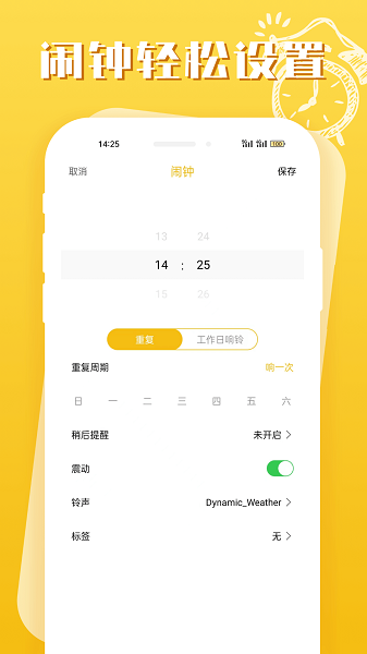 闹钟重复周期、闹钟贪睡模式,支持自定义设置闹钟模式,满足你的各种闹钟喜好。