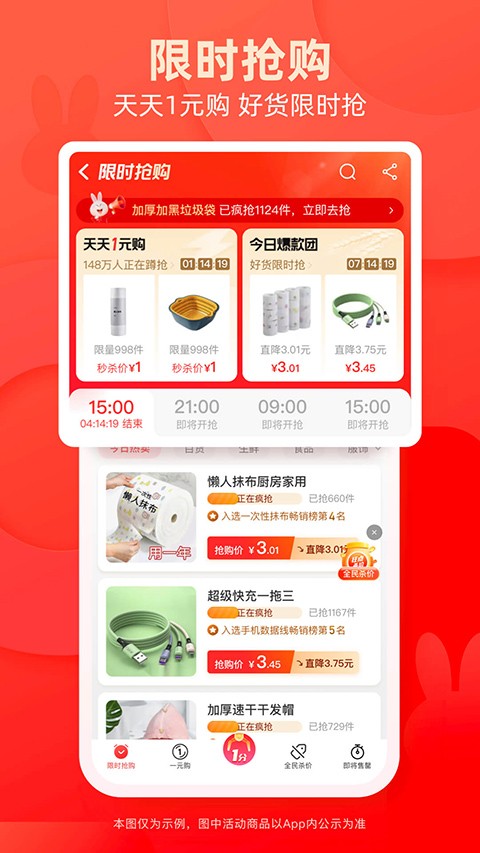1、9.9免运费,限时闪购,每天精选上百款好货,意想不到的价格,还免运费;