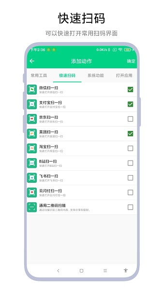 你可以根据自己使用手机的习惯添加快捷操作动作,这样就能帮助你快速一键直对应的操作界面。
