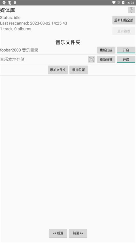 1、进入foobar2000音乐播放器手机版后把这个“开启”一下,因为只有将这个打开才能扫描到本地存储的歌曲。