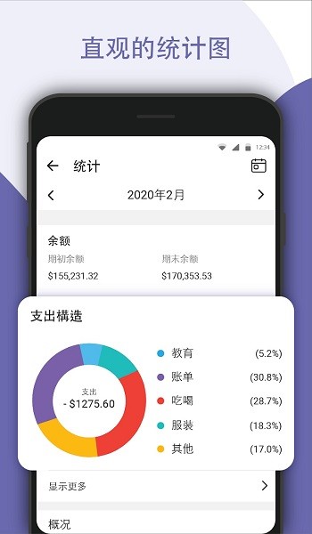 3、日常可以查看自己的花销统计图表,各个分类占比显示很清晰。
