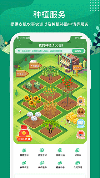 4、点击种植,查看自己的种植信息,快速进行种植登记,购买农资。