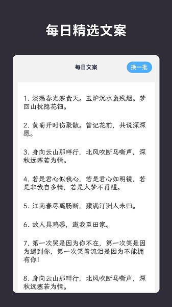 每天都会更新文案内容,具备了丰富多样的文案内容,满足不同场景的运用需求,能够根据个人的喜好选择文案的类型,都可以轻松的进行查阅。