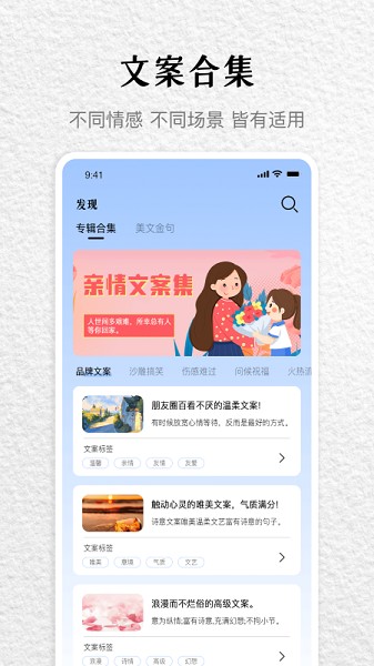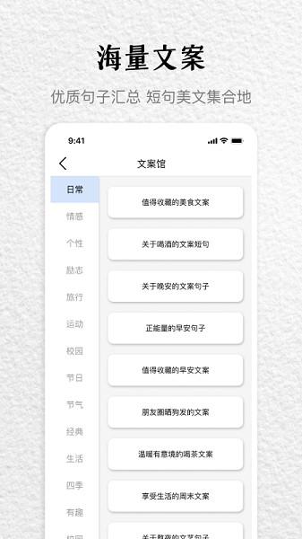 能够实时的将各种文案进行分享,把精美的文案分享出去,让更多的用户都可以进行查看。