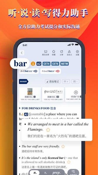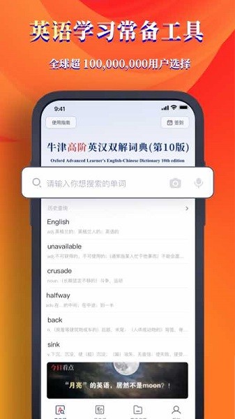 牛津高阶词典第10版电子版app可以让大家在手机上自由的查询任意的单词,输入单词后就可以快速找到了,能够查看各个单词的详细释义,都可以进行中英文对照,怎么进行点读也是支持的,根据自己的需求收藏各种单词进行复习。