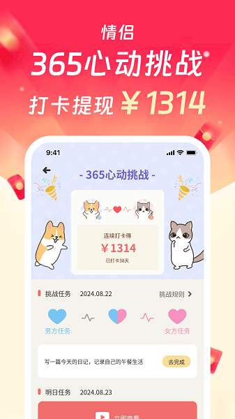 参加365心动挑战,打卡365天,赢取1314元爱情红包,见证你们的爱情长跑~