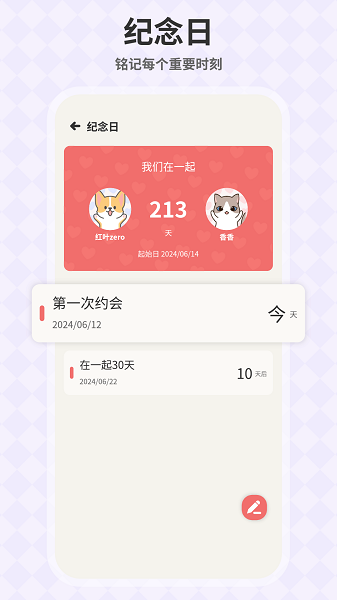 3、能够记录恋爱的天数,设置恋爱的纪念日也可以及时的进行提醒。