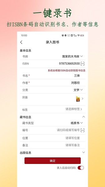 扫图书的ISBN条码,自动识别出书名、作者等信息,无需手动填写,录书更高效、更方便。