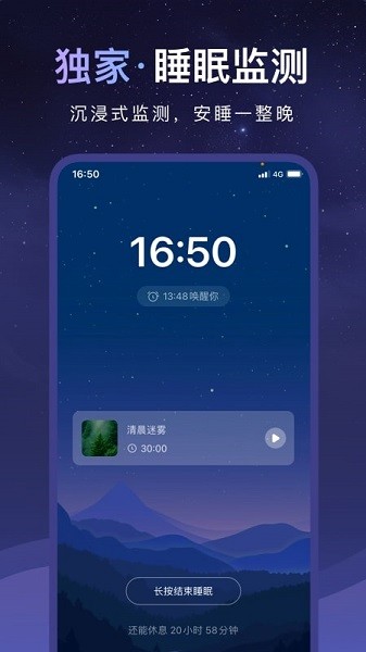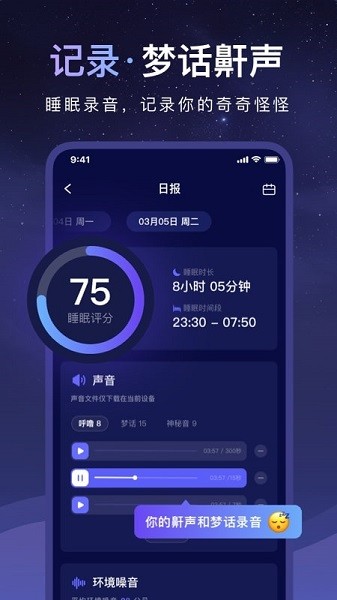 2、提供自然白噪音、精准的睡眠监测以及专业的指导,帮助用户缓解压力和焦虑。