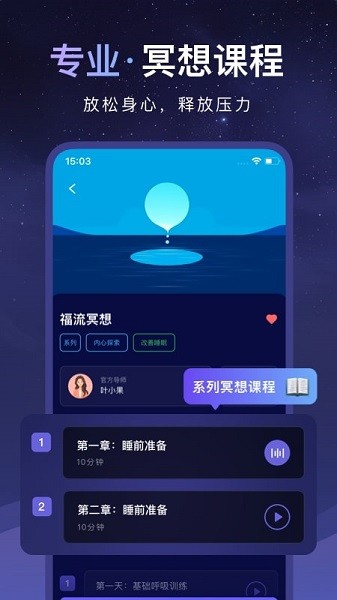 3、冥想引导,提供专业的声音冥想指导,帮助用户降低焦虑,恢复身心健康。