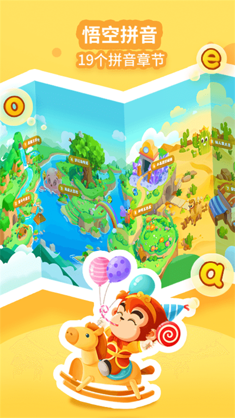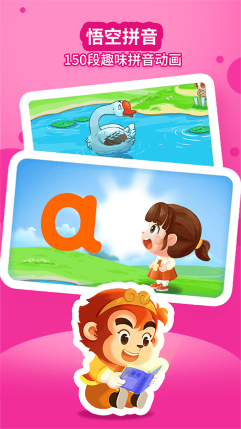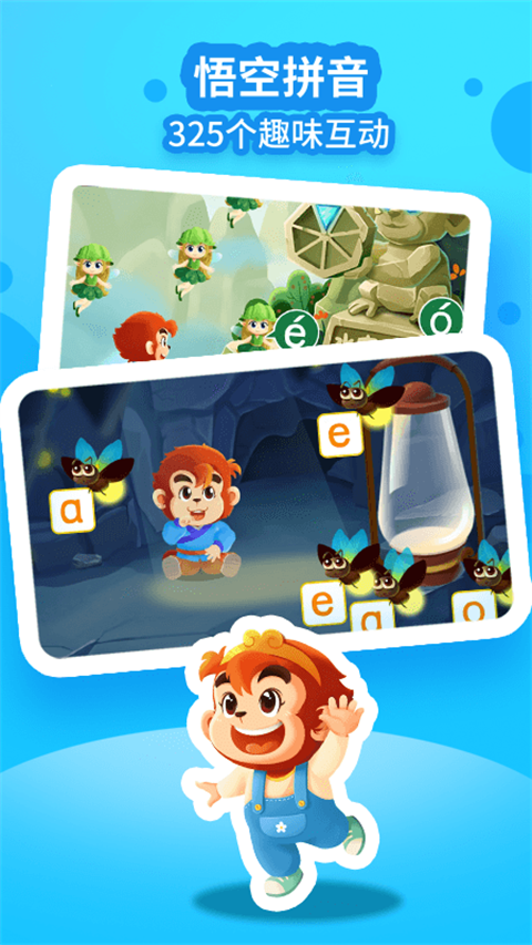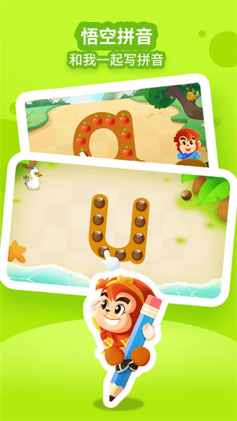 1、动画教学:悟空拼音采用卡通风格,将拼音知识融入动画和游戏中,让学习过程生动有趣。 孩子们可以在轻松愉快的氛围中学习拼音,提高学习兴趣。