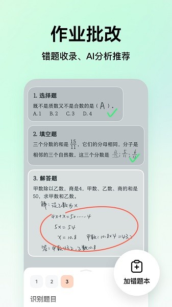 2、智能作业批改,快速准确地批改作业,并整理错题,帮用户巩固知识。
