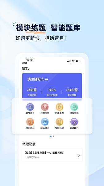 刷题模块包括章节练习、预测演练、历年真题、考前冲刺、精华考点、模拟考场、错题巩固、收藏题目等,八大模块,助力备考。学练结合,抓住碎片化时间查漏补缺;同时拥有三种刷题模式,试题题型丰富,可全真模拟,是你学习的好帮手。