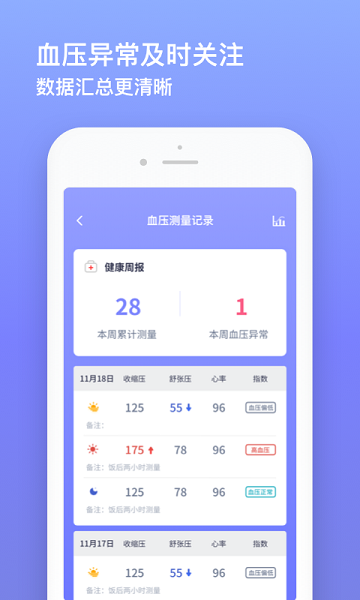 3、长期跟踪统计血压测量数据,观察血压的变化趋势,及时发现潜在的健康问题。