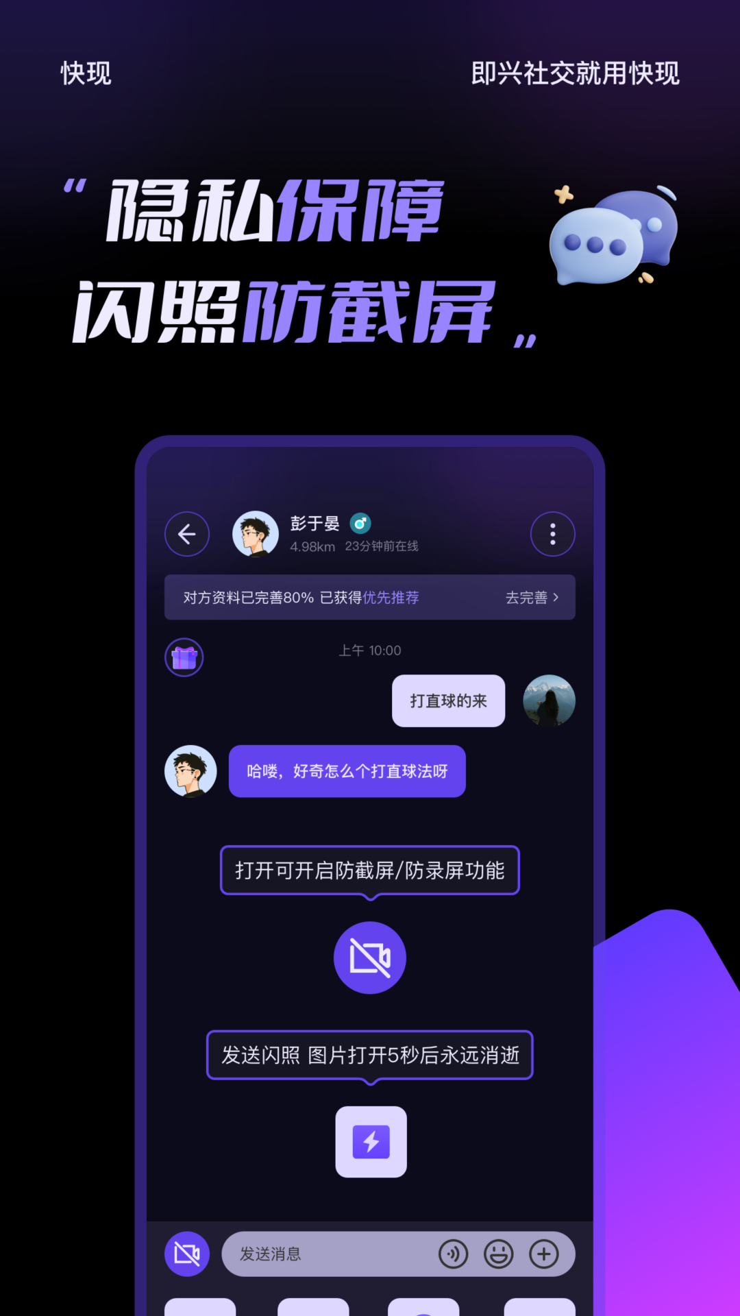 快现短视频是一款即兴社交软件,快现短视频作为新一代即兴社交平台,致力于为用户提供更高效、真实、精准的社交体验。它遵循用户本能的社交需求,搭载平台深度协同过滤算法系统,帮助用户快速找到志同道合的朋友,实现深度沟通和联系。为用户提供了一个轻松、自由、有深度的社交空间,无论是达人还是学习者,都能在这里找到属于自己的社交圈子和乐趣,有需要的用户直接下载就可以开始体验了。