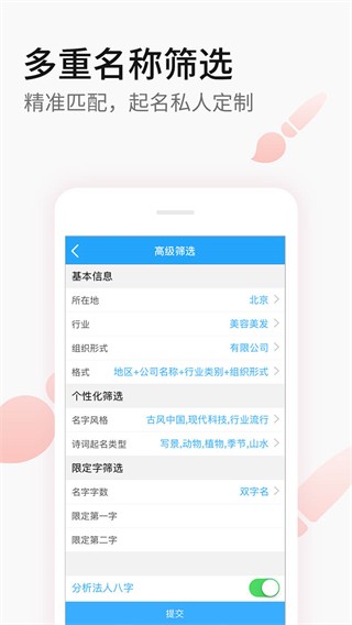 提供按城市、行业、命名风格、内涵风格、限定字符等过滤功能,实现公司名称私人定制。