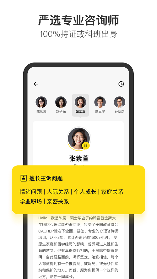 ② 查看咨询师的档案,可结合咨询流派、工作时间、擅长领域、善用疗法等维度进行选择。相比于专业资质和从业经历的不同,「第一眼好感」也很关键,有助于快速建立稳定的信任关系,甚至更能影响咨询效果。