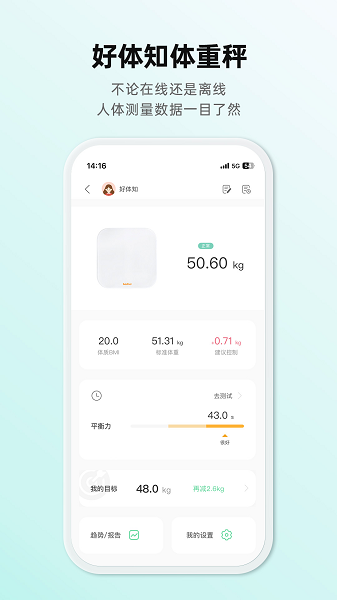 好体知app可以让大家连接智能体脂秤,能够时刻关注自己的身体健康,将检测的各种数据都记录下来,之后生成图表查看趋势都很方便的。在这里可以设置自己的减肥计划,还可以控制自己的饮食,想怎么打卡完成各种计划都行的。