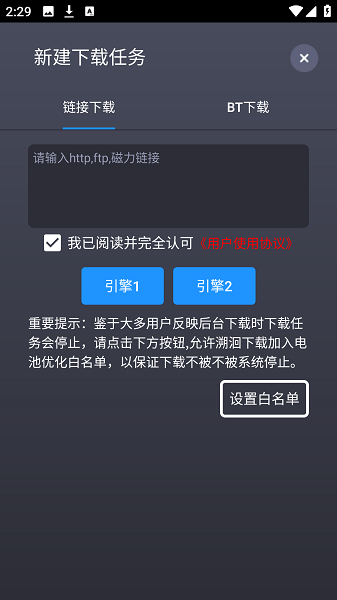 为了保证下载任务不被系统停止,建议用户点击下方按钮,允许溯洄下载加入电池优化白名单。