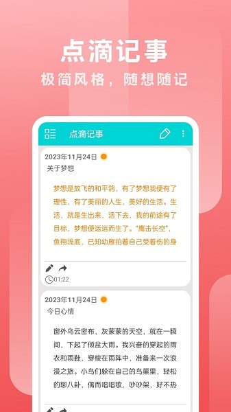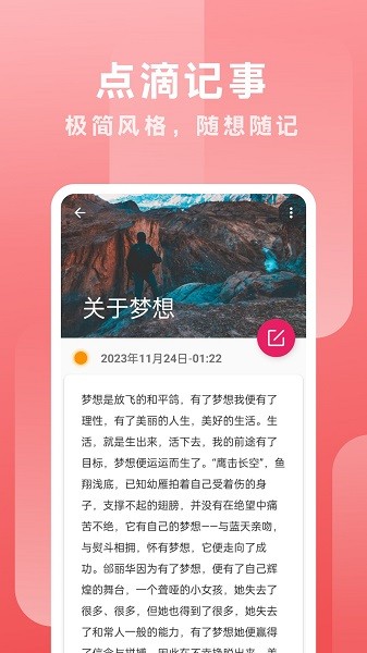 点滴记事app最新版为大家带来了非常实用的记事工具,在这里想怎么进行记事都行的,能够根据自己的需求将记事进行分类,下次回看都很方便的。大家可以在记事的时候添加图片附件了,轻松进行图文排版,编辑记事内容都很轻松。