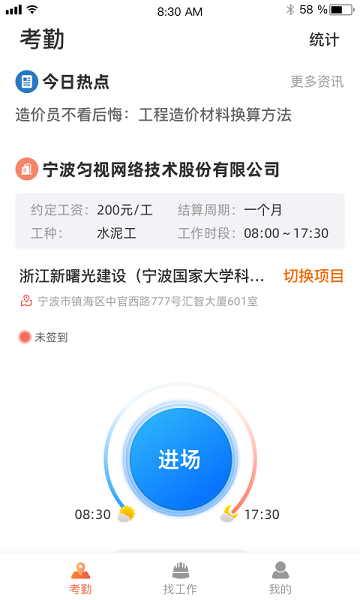 太公工人app可以让广大工人轻松使用平台记录自己的考勤信息,每天上下班都可以在这里进行打卡,想怎么查看统计的考勤信息都行的,之后进行工资对账也很防败的,能够快速将工资提现。线上提供了招工找活专区,能够自由的筛选。