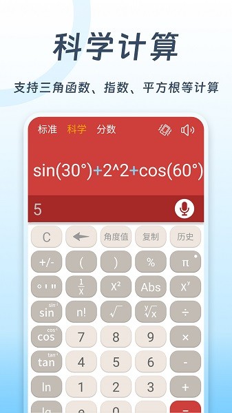 2、支持基础计算、分数计算、指数运算、三角函数运算、反函数计算等多种数学运算。