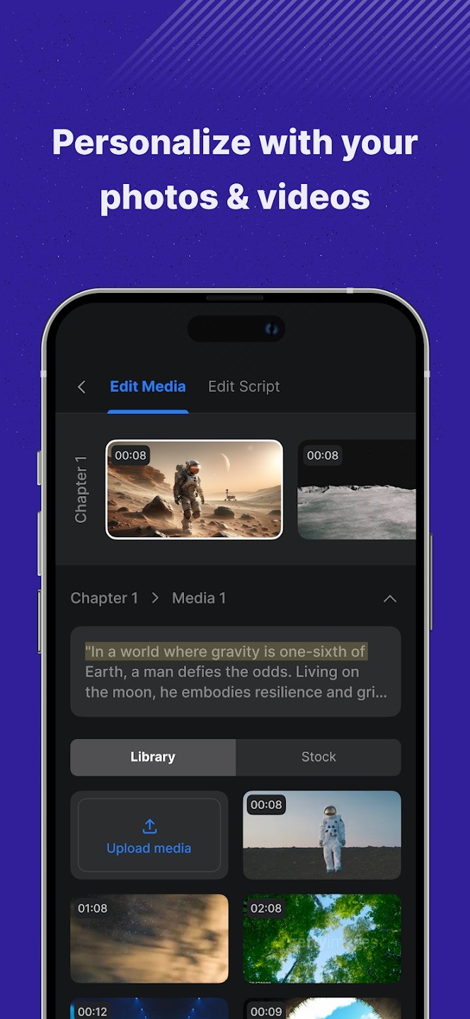 访问超过 1600 万个库存媒体选项,可通过 AI 进行搜索,确保其与您的视频主题完美契合。