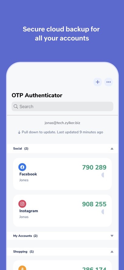 OneAuth OTP 验证器可保护您 Zoho 和非 Zoho 帐户的安全。将您的 OTP 密码备份到云端,这样您将永远不会被锁定。