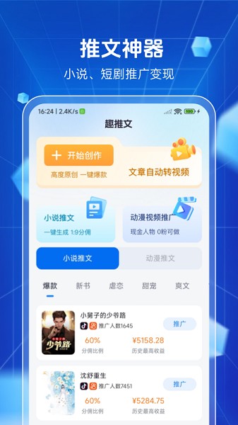 趣推文app为大家带来了视频推文神器,无论是文字视频还是漫画视频都可以进行一键生成,想怎么使用各种免费的素材都行,做完成的视频可以直接进行分发的,上传到各个平台上都非常的轻松。这里可以轻松上手使用AI工具进行辅助,非常的方便。