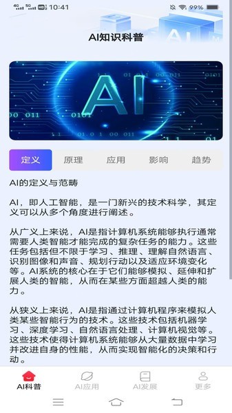 1、集AI科普、AI应用和AI发展于一体的智能应用,为用户提供全面的AI学习资源和工具。